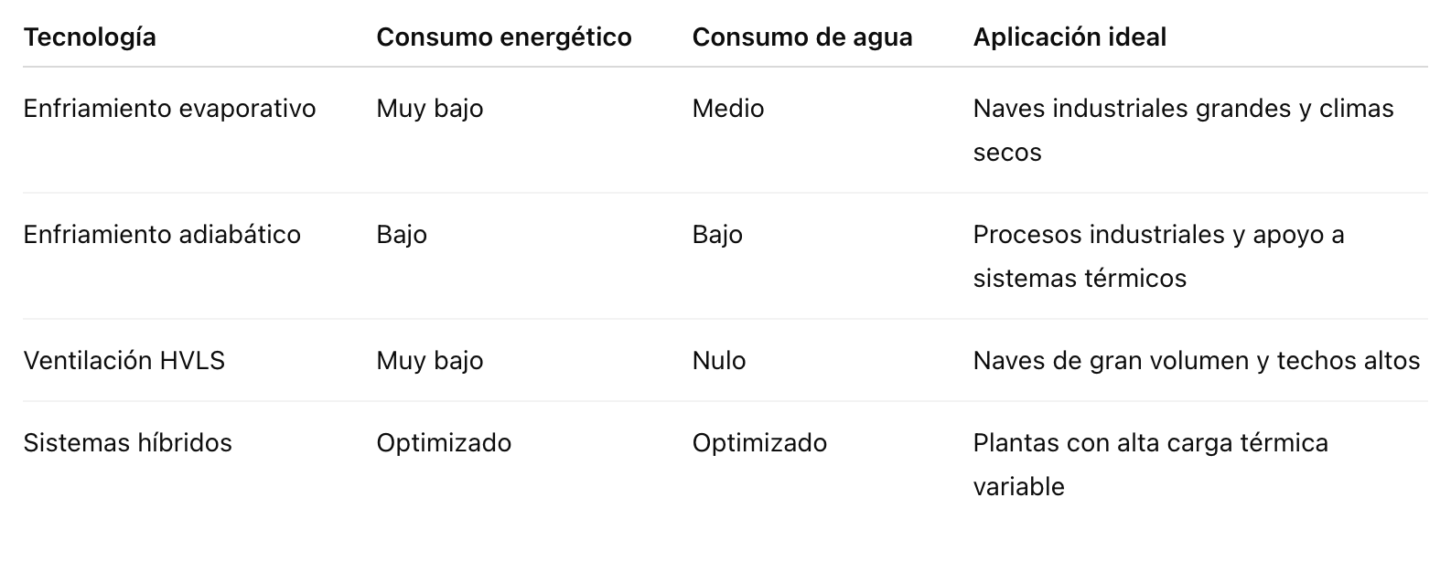 La combinación de tecnologías permite lograr mejores resultados. Integrar ventilación eficiente con enfriamiento evaporativo o adiabático permite adaptar el consumo energético según las condiciones de operación.